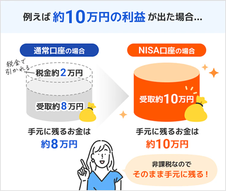 通常、株式や投資信託の売却益には約20%の税金がかかりますが、NISA口座で投資した場合、税金がかからないため利益をまるまる受け取ることができます。